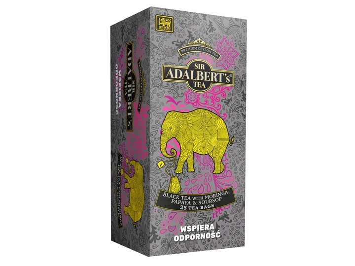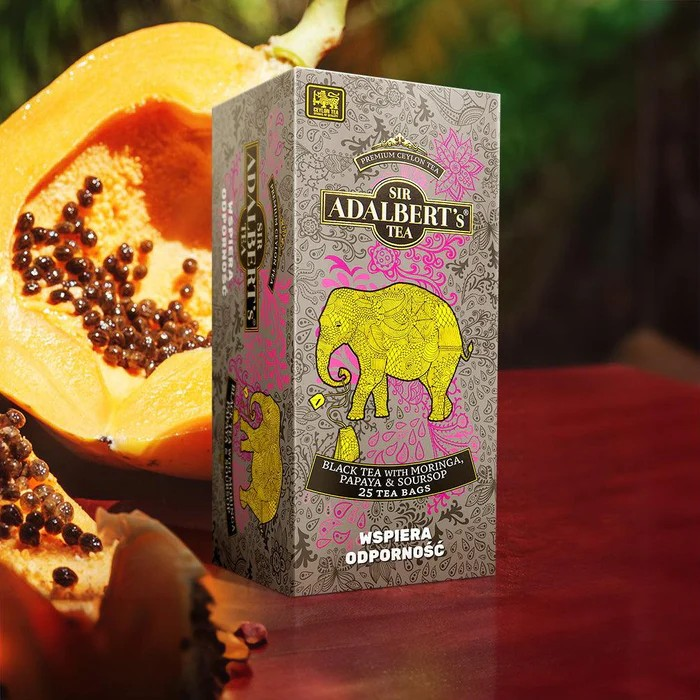 Herbata Moringa, Papaja i Soursop Adalbert’s Tea wspiera odporność. To wyjątkowe połączenie czarnej herbaty z egzotycznymi owocami jest niezapomnianą podróżą dla naszych zmysłów. Niesamowite połączenie powyższych, niezwykle cennych składników ma bardzo pozytywny wpływ na nasz cały organizm, szczególnie korzystnie wpływa na odporność układu immunologicznego.