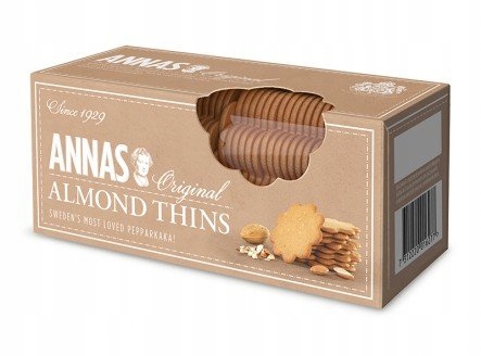 Ciastka ANNAS to produkt o długiej tradycji sięgającej XIX wieku. Receptura, z której korzysta marka ANNAS, jest pilnie strzeżoną tajemnicą – przekazywaną z pokolenia na pokolenie. Współczesna wersja Almond Thins jest kontynuacją tej tradycji, wzbogaconą o naturalny aromat migdałów i przypraw korzennych. Każde ciasteczko jest cienkie i delikatne, lecz jednocześnie chrupiące, co świadczy o doskonałym wyważeniu składników i perfekcyjnym wypieczeniu.