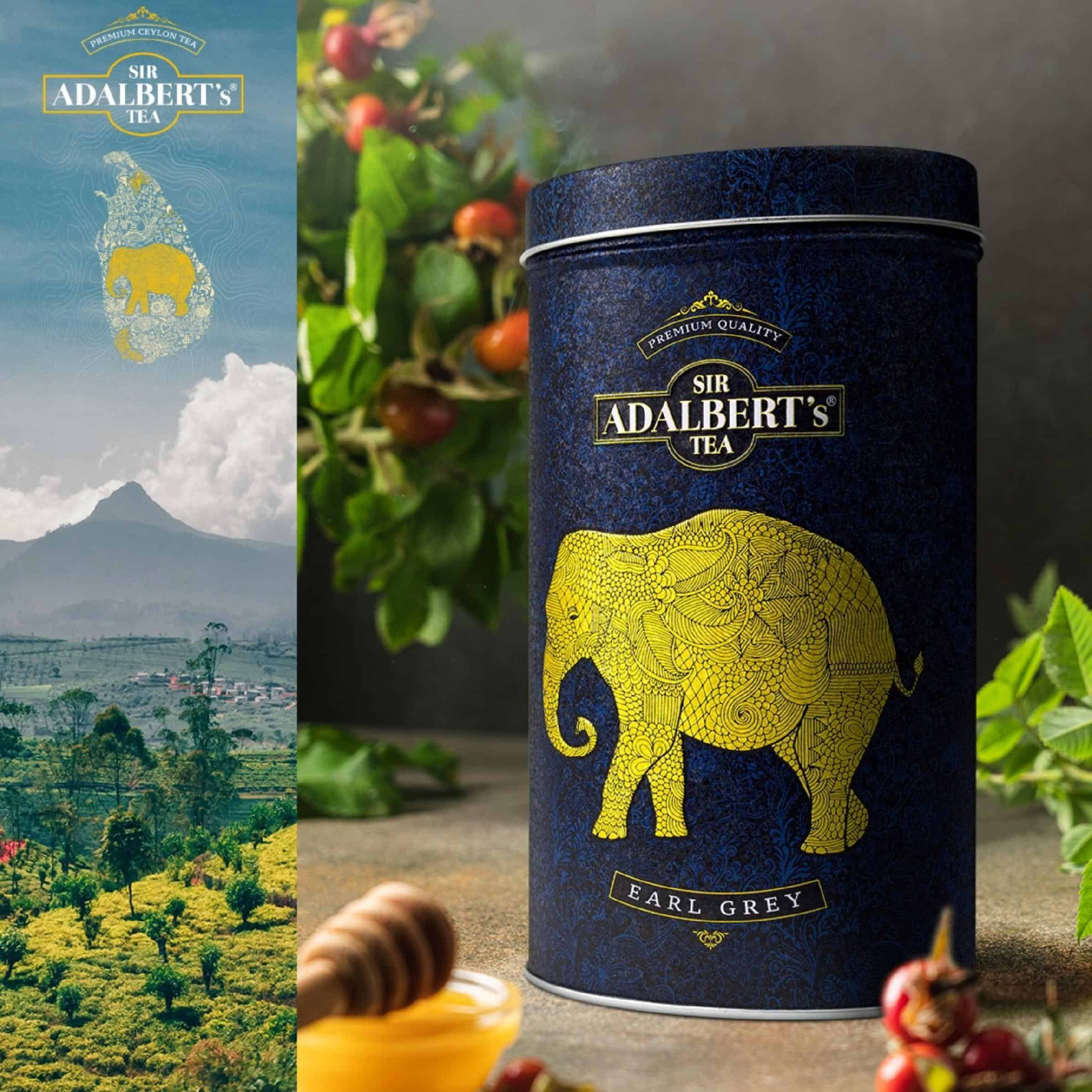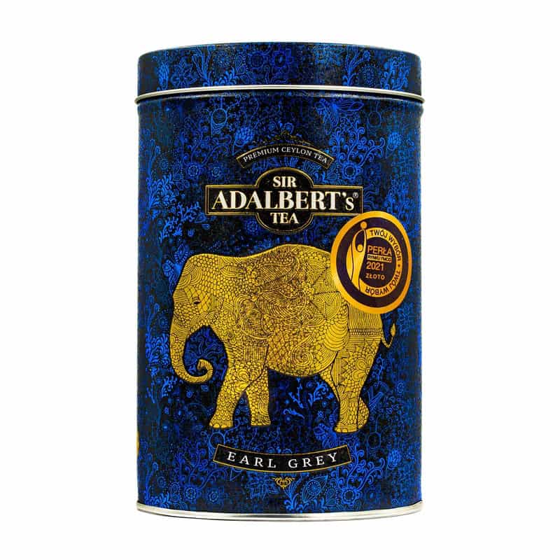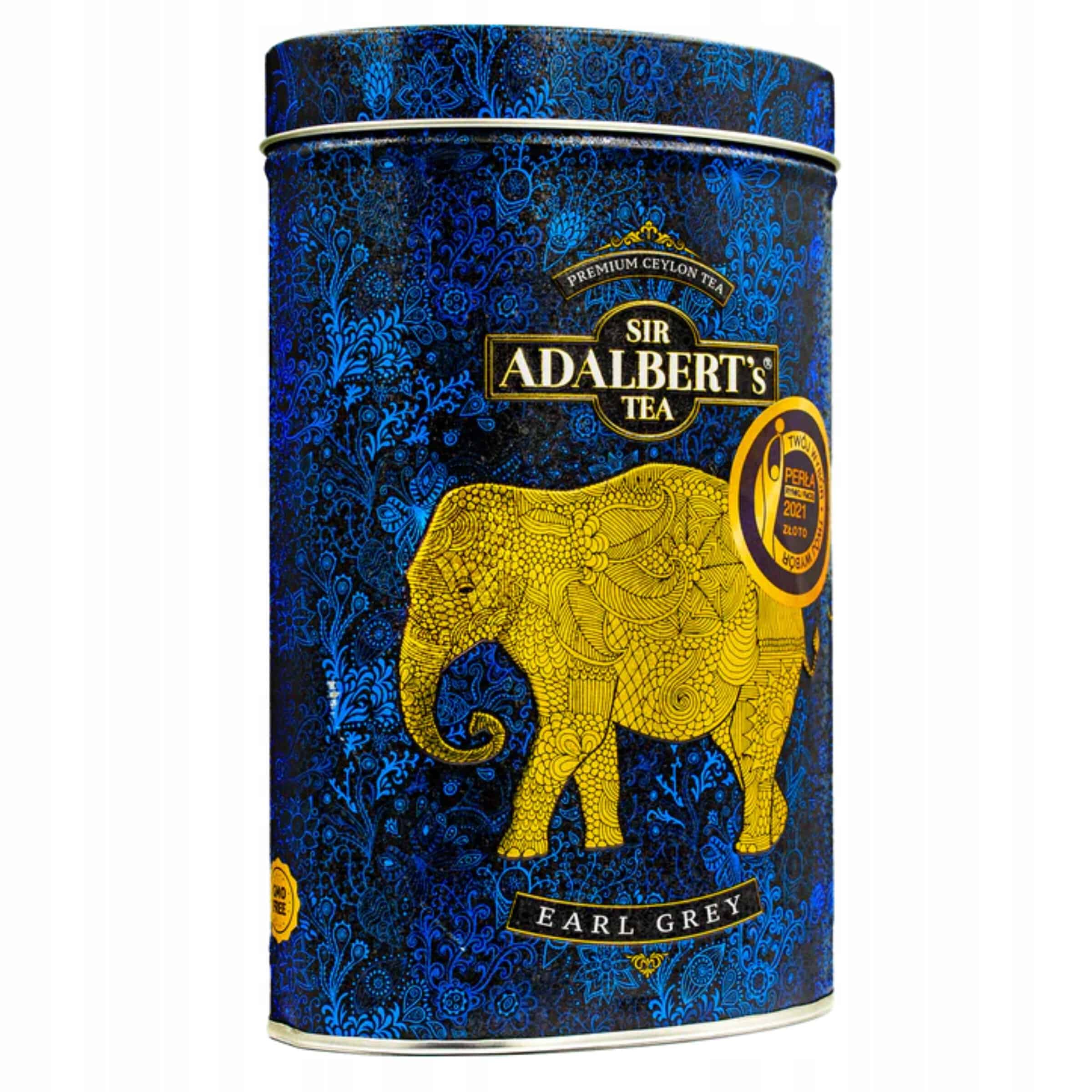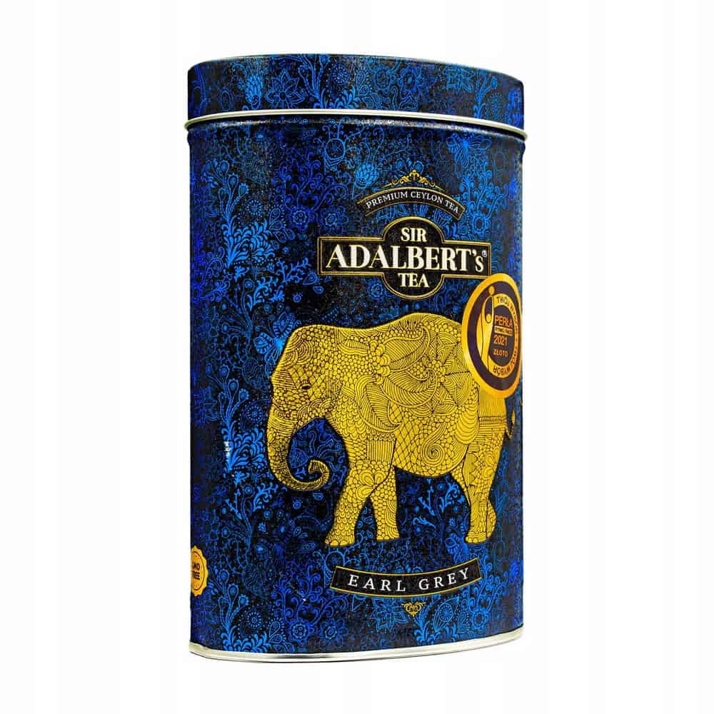 Ekspresowe herbaty Earl Grey od Sir Adalbert’s Tea w eleganckim metalowym opakowaniu z złotym słoniem. Idealne do aromatycznej filiżanki czarnej herbaty premium.Herbata ADALBERT’S TEA EARL GREY Puszka