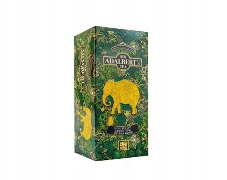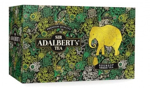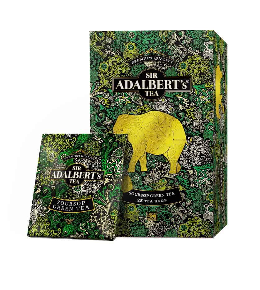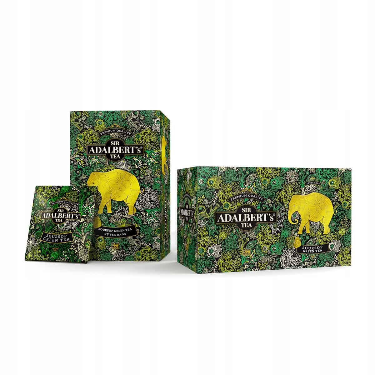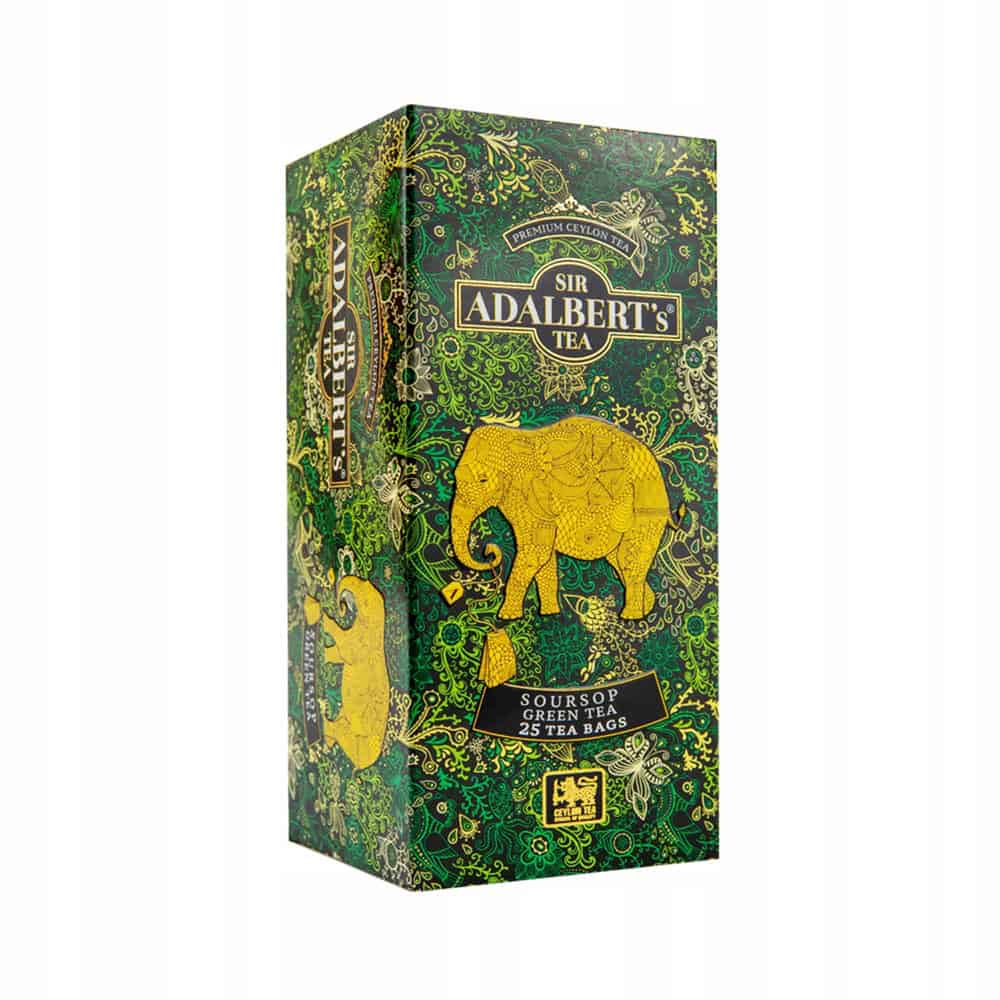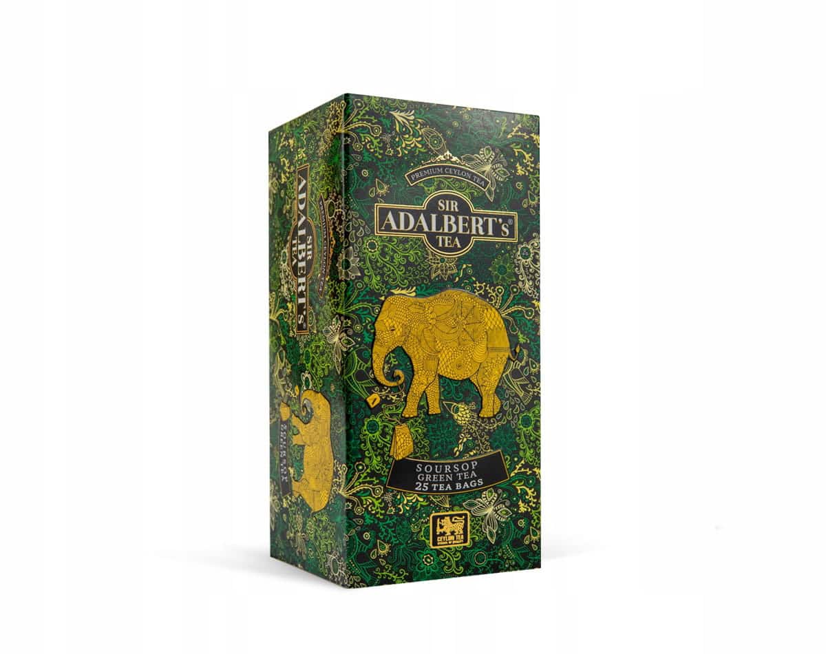 Delikatne zdjęcie zielonego zestawu herbaty Adalbert's z ilustracją słonia, wytwarzane z wysokiej jakości liści herbaty z Ceilonu, idealne do relaksu i aromatycznej degustacji.Herbata ADALBERT’S TEA SOURSOP GREEN TEA – SASZETKI