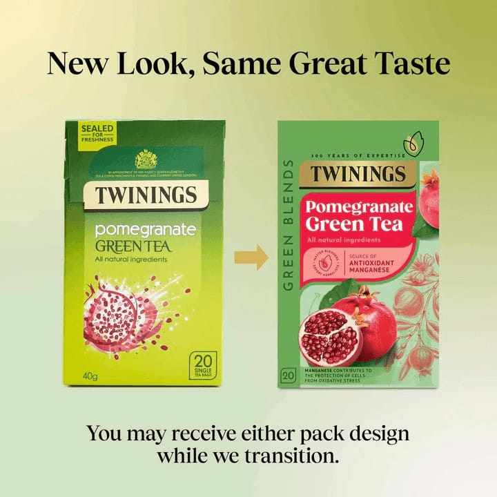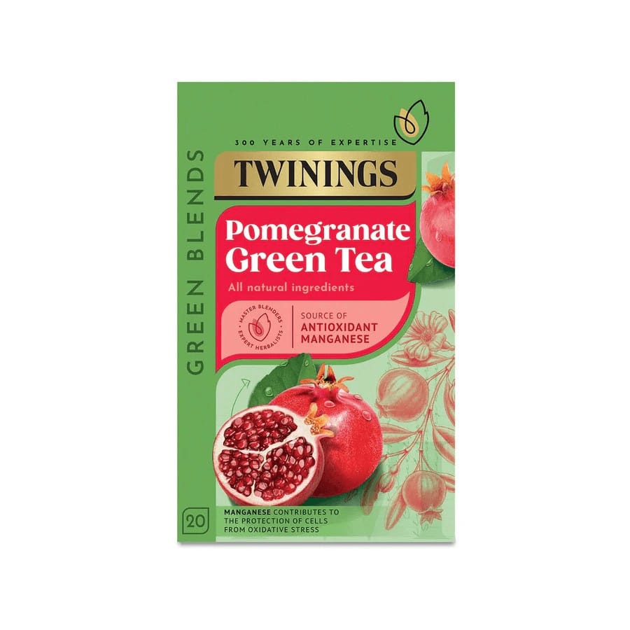 Łatwy do odczytania zielny herbata z granatu i zielonej herbaty Twinings z naturalnymi składnikami, bogata w antyoksydanty i mangan, wspiera ochronę komórek i zdrowy styl życia.Twinings Green POMERGRANATE 20